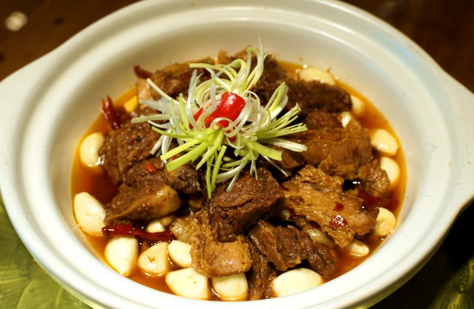 6、倒入牛肉原汤煮浓,再整锅倒入高压锅放入青椒,压10分钟;回锅收汁装盘。