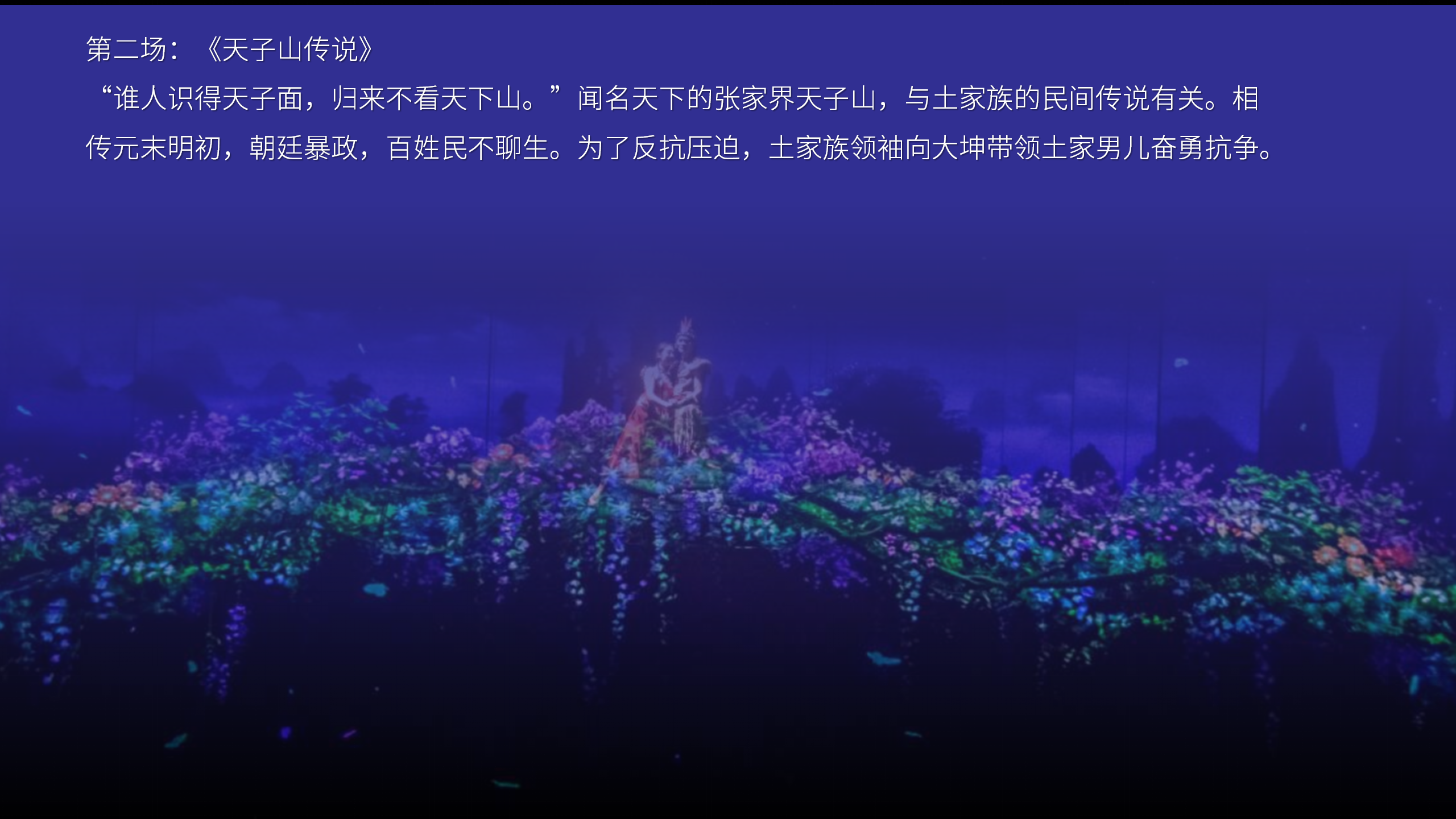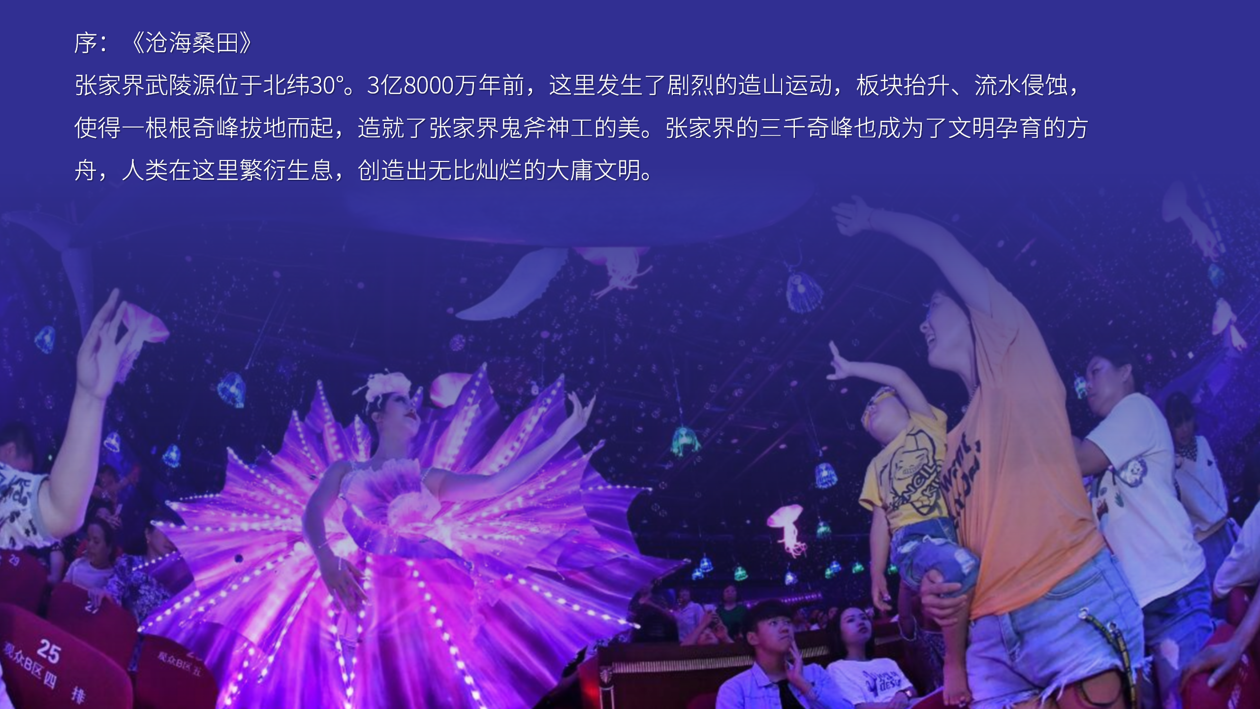 以张家界丰富的自然与人文资源为背景,打造的一场震撼人心的演艺盛宴。通过高科技的舞台效果与精彩的剧情演绎,展现了张家界从远古至今的壮丽史诗和动人传说,让游客在视觉与心灵的双重震撼中,感受张家界独特的文化魅力。